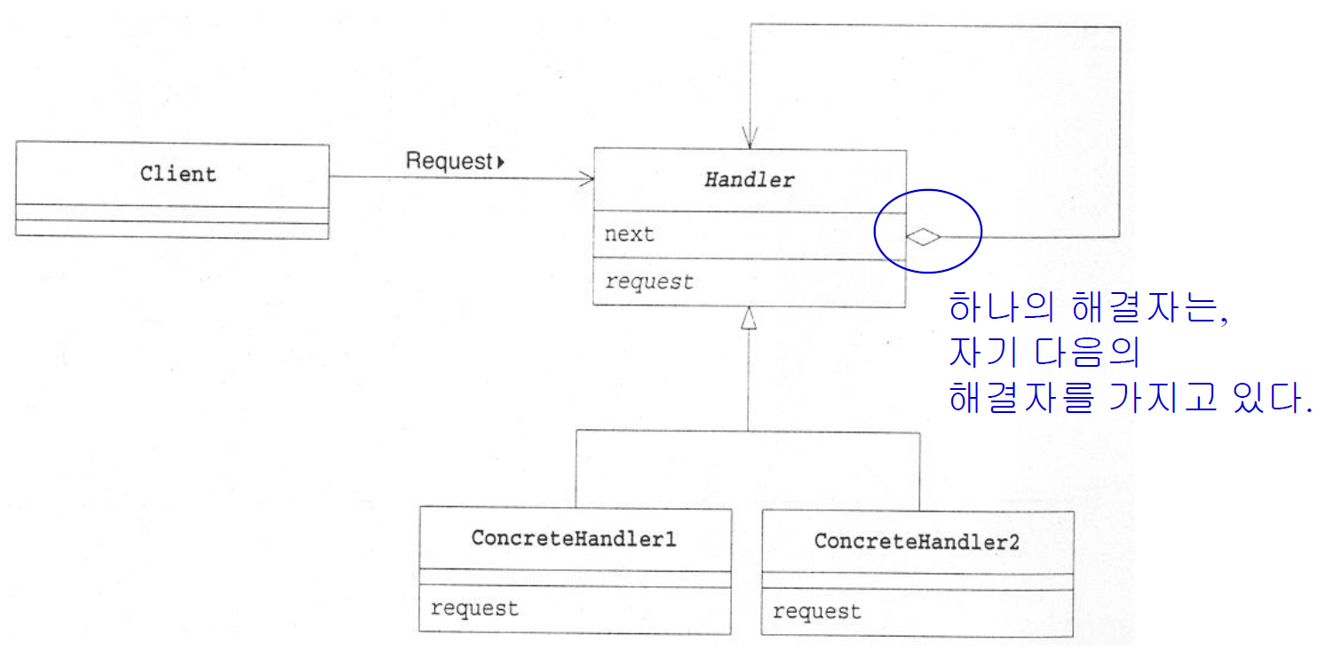 어떤 요구가 발생했을 때 그 요구를 처리할 객체를 바로 결정할 수 없는 경우에는 다수의 객체를 사슬처럼 연결해 두고 객체의 사슬을 차례로 돌아다니면서 목적에 맞는 객체를 결 정하는 경우