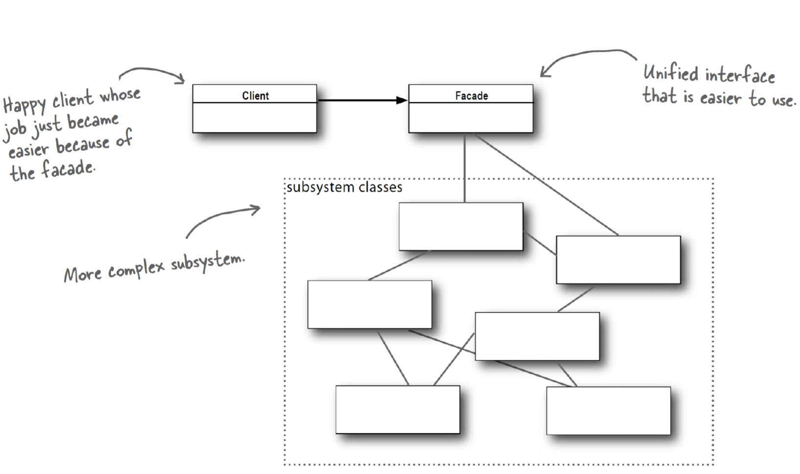 Facade : 복잡한 서브시스템에 대한 단순한 인터페이스 제공이 필요할때. 클라이언트와 구현 클래스 간에 너무 많은 종속