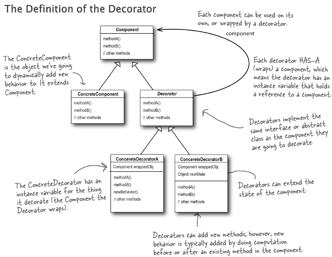 Decorator : 객체에 동적으로 새로운 서비스를 추가 할 수 있게 한다. 기능의 추가를 위해서 하위 클래스를 생성하는것보다 융통성 있는 방법을 제공. (상속보다 위임을 통하여 제공)