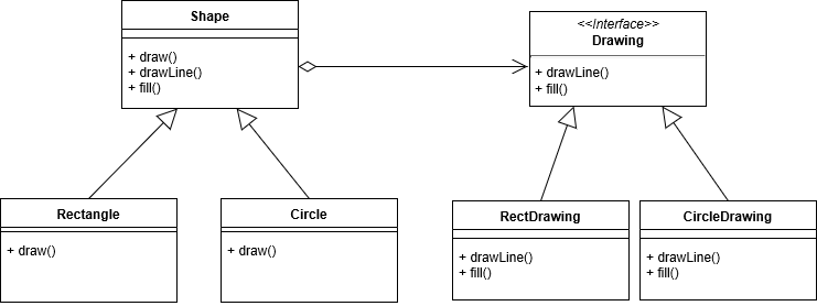 추상적 개념과 이에 대한 구현 사이의 지속적인 종속 관계를 피하고 싶을 때 사용. 추상적 개념과 구현 모두가 독립적으로 서브클래싱을 통해 확장되어야 할때 사용.