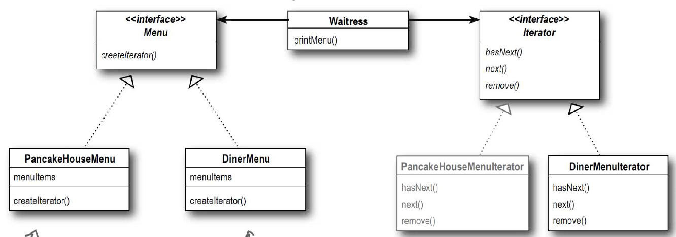 모든 항목에 일일이 접근하는 작업을 컬렉션 객체가 아닌 반복자 객체에서 맡게 된다. 이렇게 하면 집합체의 인터페이스 및 구현이 간단해질뿐 아니라, 집합체에서는 반복작업에서 손을 떼고 원래 자신이 할 일에만 전념할 수 있음.