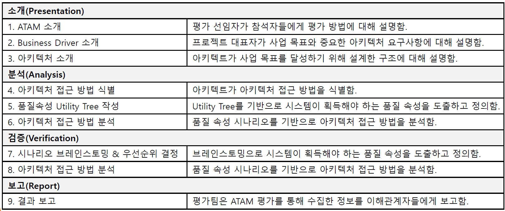 아키텍처가 품질 목표를 만족하는지 여부와 품질 목표간에 발생하는 충돌에 대해서도 분석함.