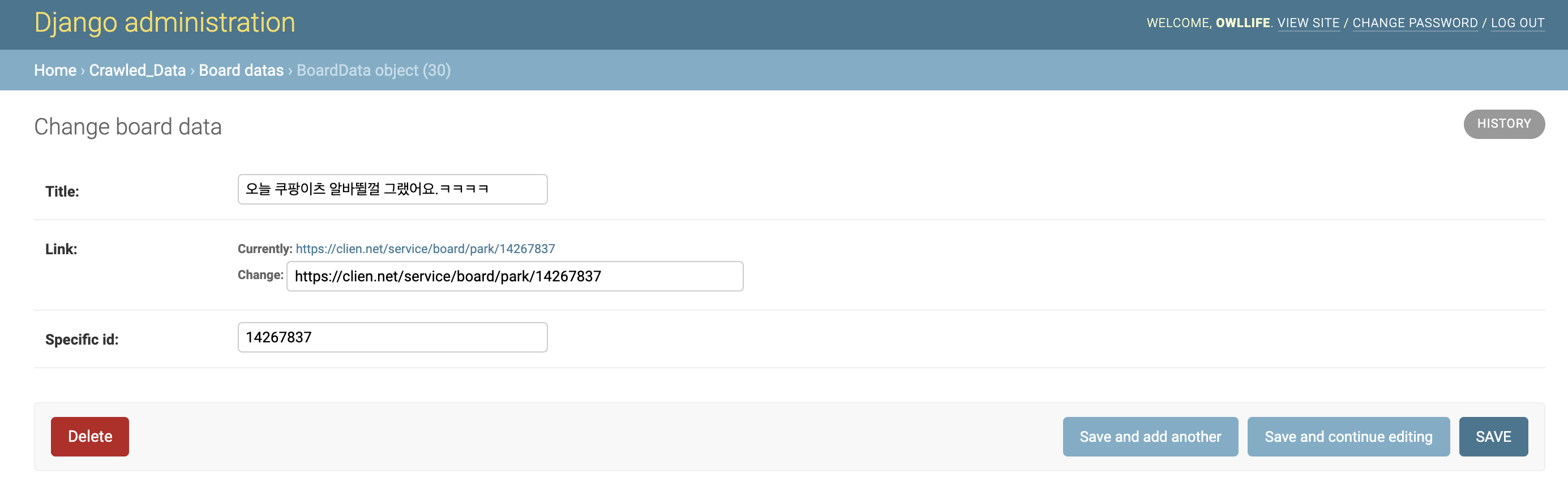 Django가 어떤 앱을 admin에서 관리하도록 하려면 앱 폴더(crawled_data) 안에 있는 admin.py 파일을 수정해 주어야 합니다.