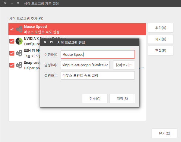 xinput 변경값은 시스템이 재부팅되면 다시 리셋이 되어 또 다시 설정을 해 주어야 합니다. 이런 번거로움을 없애기 위해서는 "시작 프로그램"을 통하여 재부팅 될때마다 자동으로 스크립트를 실행 하도록 합니다.