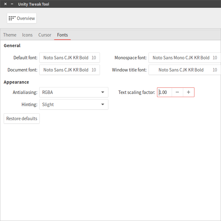 폰트는 위와같이 설정하였습니다. Ubuntu 16.04 에서는 기본적으로 Noto Sans 폰트를 포함하고 있기 때문에 해당 폰트를 기본으로 설정하였고, monospace 또한 Noto Sans Mono로 변경하였습니다.